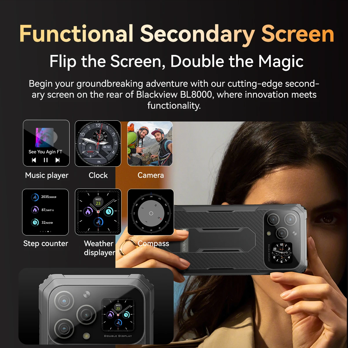 Pantalla trasera:1,3 pulgadas, resolución 240*240; CORNING®GORILLA * GLASS 3(Victus); Frecuencia de actualización de 60Hz